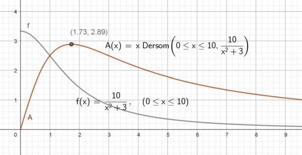 Fra den røde grafen ser man at det største arealet er når B har en x verdi på 1,73.