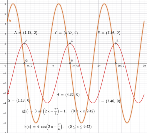 Vi har funksjonen $g(x) = 3sin(2x- \frac{\pi}{4})-1 \quad D_g= [0, 3 \pi>$ | |||