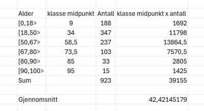 Vi antar at adersdordelingen gruperer seg rundt klassemidpunktet. Altå at gjennomsnittsalderen i første intervall er 9 år ((18-0)/2), I andre intervall blir kassemidpunkt 34 år (50-18)/2 + 18 osv. Dette vet vi ikke. Det er en antakelse. Vi multipliserer antallet i hvert intervall med klassemitdpunktet for å finne den tottale alder i hvert intervall.