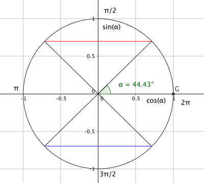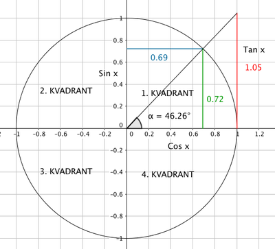 Sinusverdien leses på y aksen (blå) og cosinus på x - aksen grønn.