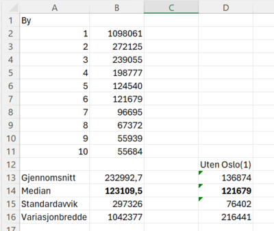 Vi ser at Oslo påvirker gjennomsnitt og spredningsmål veldig, fordi byen er så mye større enn alle de andre tettstedene. Vi observerer at medianverdi forandrer seg lite og er derfor den som beskriver datamaterialet best.