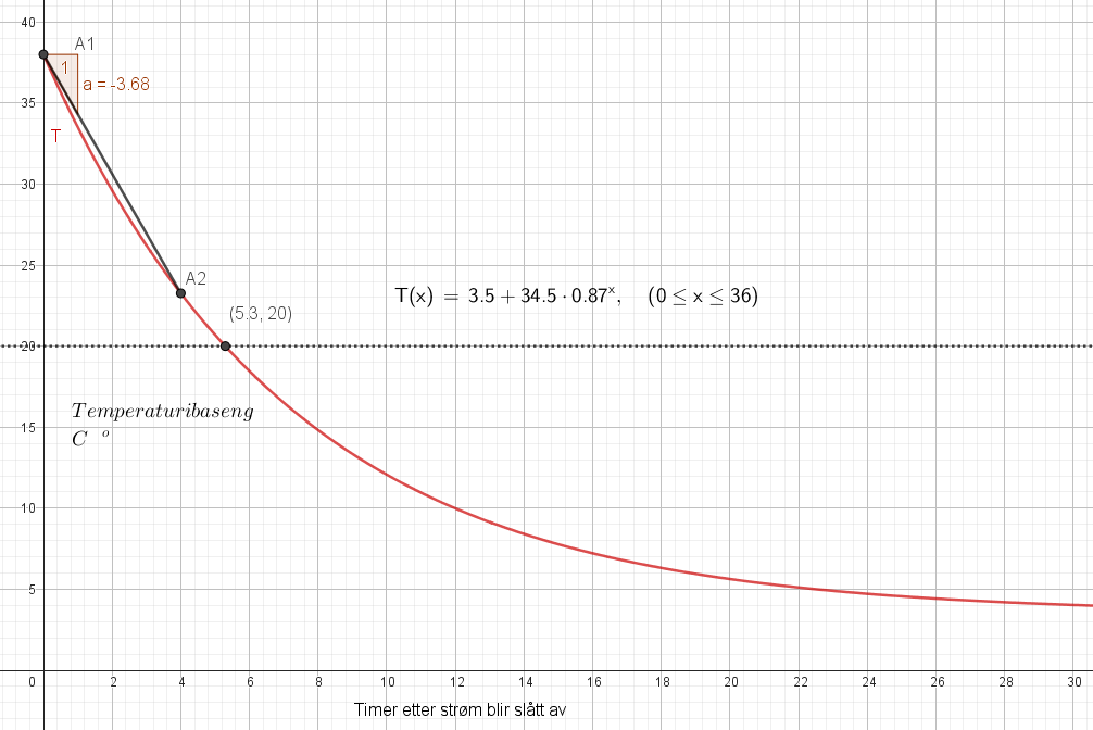 Da er x null, så temperaturen blir da 3,5 + 34,5 = 38 grader celsius når strømmen slåes av.