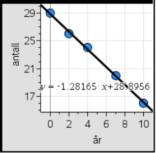 En brukbar modell er f(x)= - 1,3x + 28,9