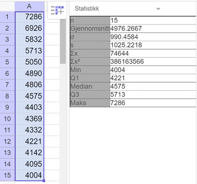Legger inn tallene i regnearket i Geogebra, bruker "analyse av en variabel", og "vis statistikk".
