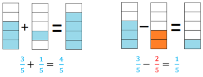 <math>\frac{3}{5} - \frac{2}{5} = \frac{3-2}{5} = \frac{1}{5}</math>