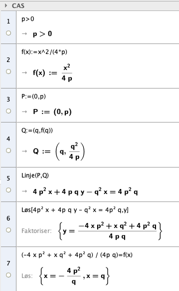 Definerer først funksjonen f. Definere så punktene P og Q. Lager så linjen gjennom P og Q. Setter linjen lik f for å finne felles punkter. x = q var jo utgangspunktet. Det andre punktet er $x = - \frac{4p^2}{q}$, som er x koordinaten til punktet R.