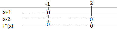 f avtar fra minus uendelig til x = -1 og fra x = 3 til uendelig. f vokser fra x = -1 til x = 3. Bunnpunktet for x=-1 er gitt i oppgaven. Man ser at f i tillegg har et maksimum for x=3.