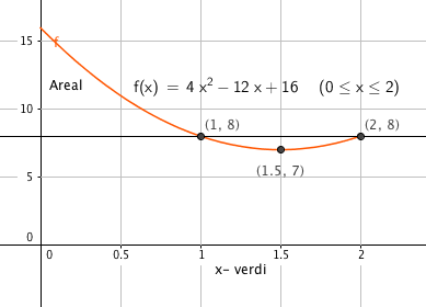 Fra Figuren ser man at arealet blir minst mulig når x = 1,5. Arealet er da 7.