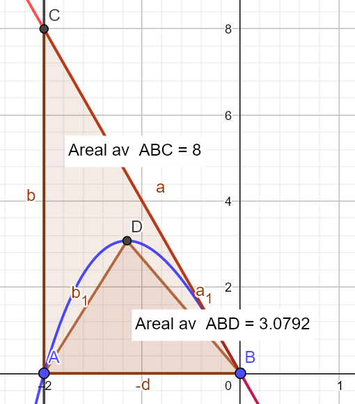 Bruker knappen Mangekant i Geogebra, og lager trekantene ABC og ABD. Bruker knappen Areal og finner arealet til trekantene ABC og ABD.