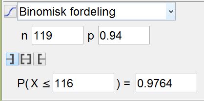 Prøver meg frem ved å endre på $n$ (totalt antall solgte billetter) i sannsynlighetskalkulatoren i Geogebra. Ser at dersom selskapet selger 119 billetter, er sannsynligheten for at alle som møter, får plass på flyet, ca. 97.6%.