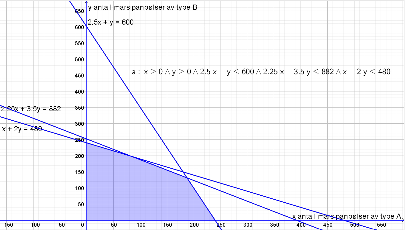 Vi har $x\geq 0$ og $y\geq 0$ fordi konditoriet må produsere 0 eller flere marsipanpølser.