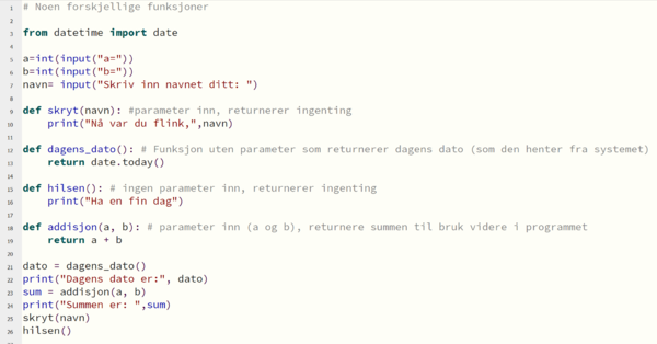 Når vi programmerer ønsker vi ofte å hente informasjon fra brukeren (inn-data), gjøre noe med den, og vise resultatet (ut-data). I Python bruker vi blant annet funksjonene '''input()''' for å ta imot data og '''print()''' for å vise data. | |||