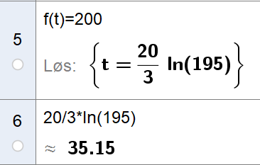 Antall skadedyr økte raskest i $t=\frac{20}{3} \cdot ln(39) \approx 24$ dager etter at huset ble invadert. Dette er vendepunktet til f(t). Da var vekstfarten på 9 skadedyr per dag.