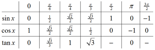Noen viktige verdier av sin x, cos x og tan x på tabellform