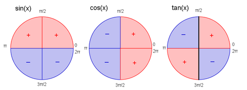 Dette diagrammet viser fortegnene til de forskjellige trigonometriske funksjonene for forskjellige vinkler. Den sorte streken gjennom tangensdiagrammet viser vinklene der <math>\tan\,x</math> går mot <math>\pm\infty</math>. Vi får et bruddpunkt, og det er derfor meningsløst å snakke of fortegnet til <math>\tan\,x</math> når <math>x=\frac{\pi}{2}</math> eller <math>x=\frac{3\pi}{2}</math>.