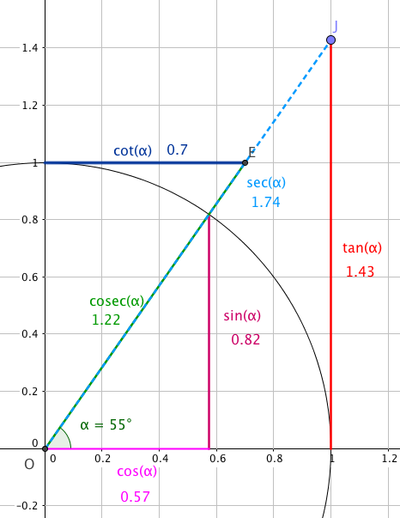 Geometrisk tolkning av de trigonometriske funksjonene. Figuren nedenfor viser de forskjellige trigonometriske funksjonene inntegnet i enhetssirkelen.