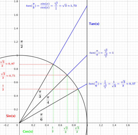 Noen viktige verdier av sin x, cos x og tan x i enhetssirkelen (1. kvadrant)