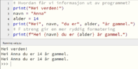 <source lang="python"> navn = "Anna" alder = 14 print("Hei", navn, "du er", alder, "år gammel.") </source>